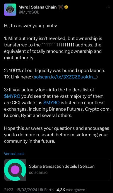 I was approached to write about another meme coin from Rug Radio. They asked me to cover $MYRO. Yes, another Dog coin that is going to change the world. It is listed on the marketplace kucoin.com. Some of the main concerns someone on reddit brought up and $MYRO team addressed were: